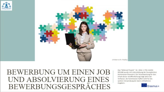 Die MiGreat! Einführungsvorträge sind einfach zu verwenden und können leicht an die speziellen Bedürfnisse der MigrantInnen angepasst werden. Die Themen entsprechen den szenariobasierten Modulen und können als Einführung zu dem Thema verwendet werden oder dazu dienen den gegenwärtigen Lehrplan zu erweitern. Sie können auch eigenständig genutzt werden.